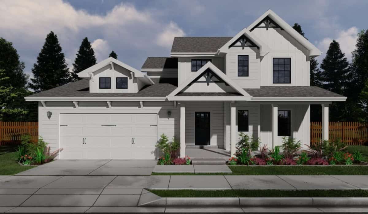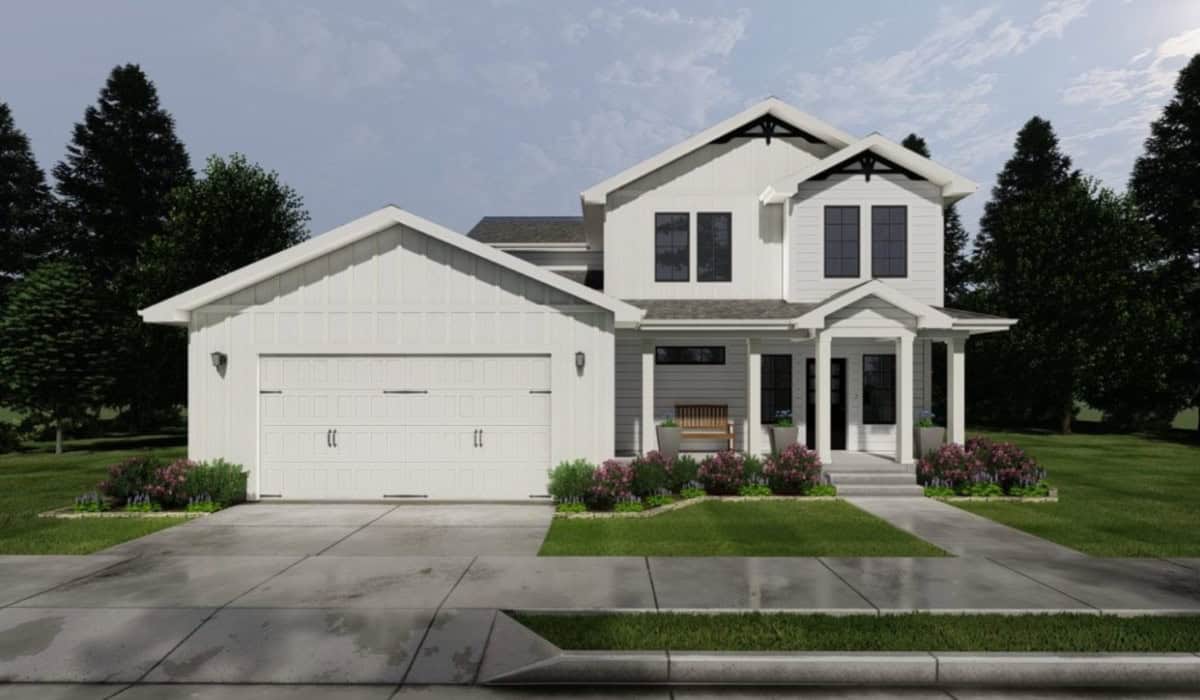- Beautiful modern white two-story home with a welcoming front porch, surrounded by well-maintained landscaping and tall trees.